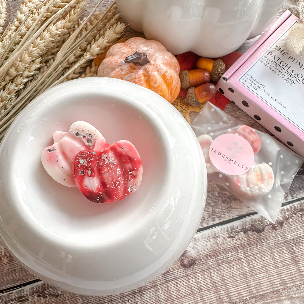 Info - three highly scented pumpkin shaped wax melts, packaged in fully recyclable packaging.