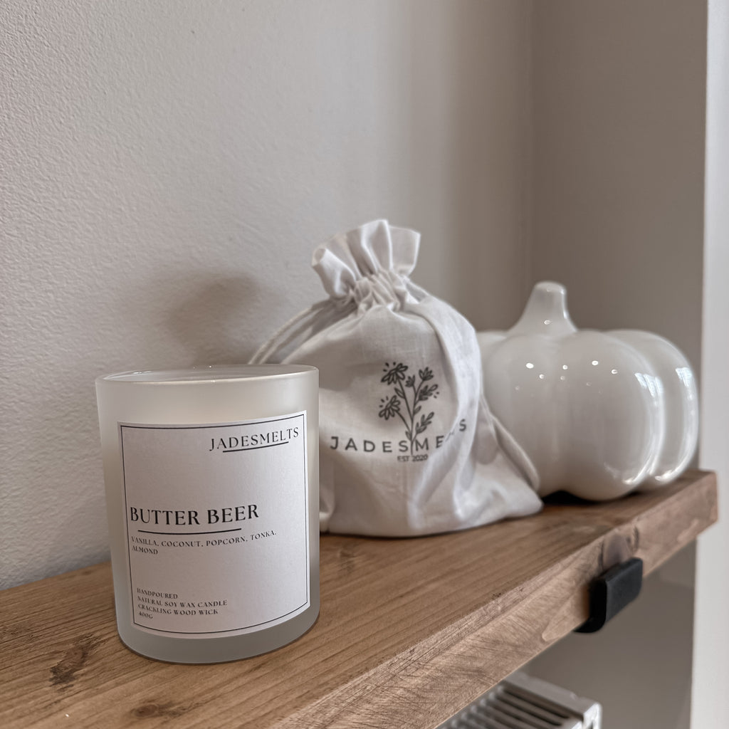 Our 20cl candles come complete with wooden lid and are packaged in our signature printed cotton pouches.