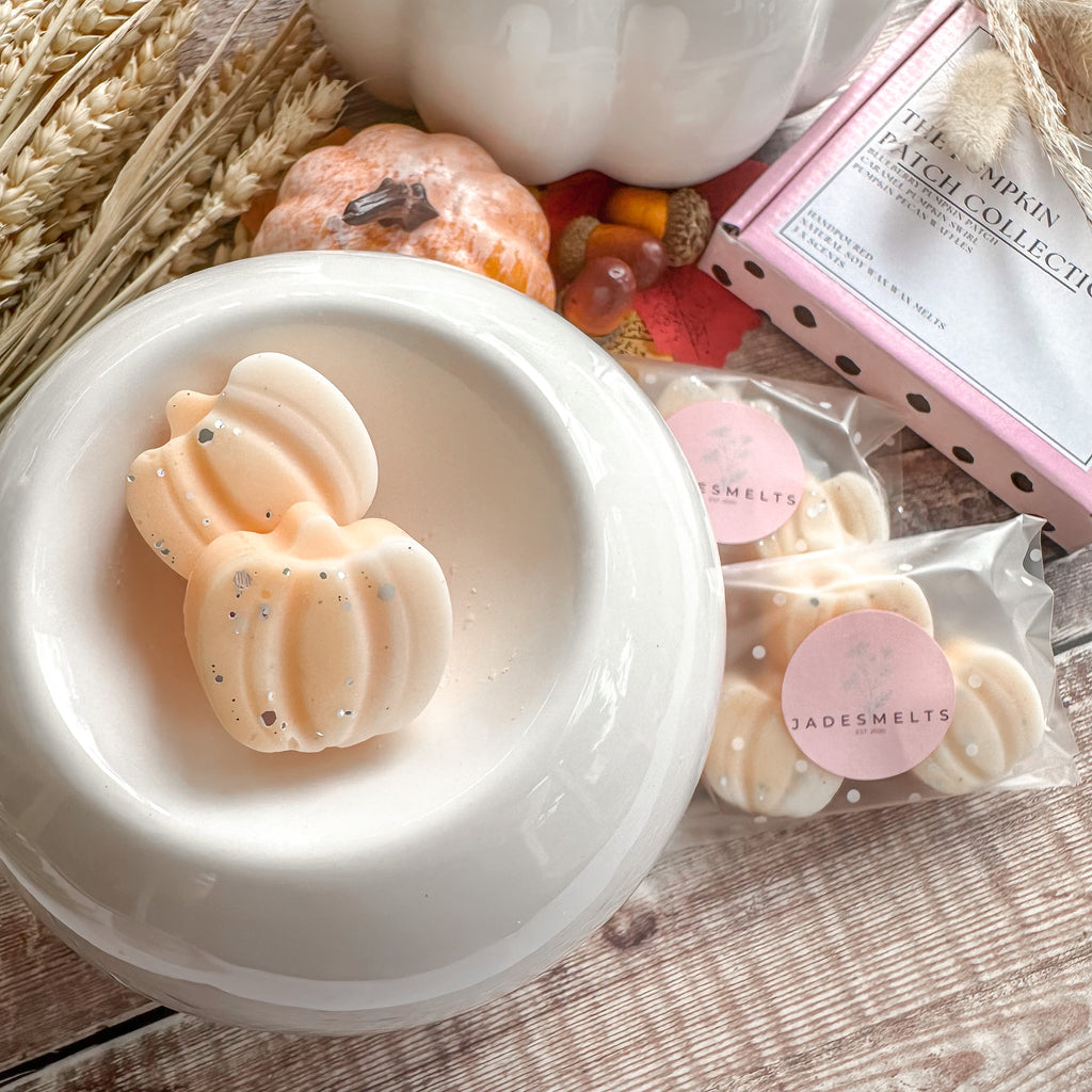 Info - three highly scented pumpkin shaped wax melts, packaged in fully recyclable packaging.
