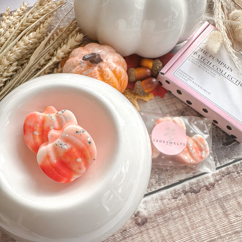 Info - three highly scented pumpkin shaped wax melts, packaged in fully recyclable packaging.